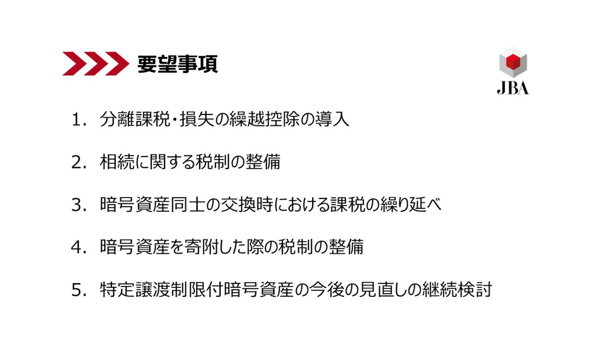 @crossroadhf日本ブロックチェーン協会が政府に「暗号資産税制5提案」を提出。売却益を株と同じ20%課税、損失繰越・相続/寄付優遇、コイン交換の課税繰延、企業トークン税の見直しを要望。国内産業の育成と海外流出防止が狙い。 #仮想通貨 #税制改正 #JBA