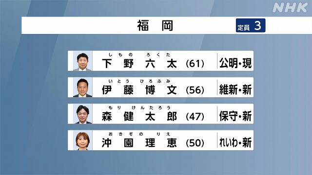 @niconicomarket福岡選挙区 定数3 開票率72% NHK開票速報より 国民民主、川元氏怒涛の追い上げで三つ巴。 熾烈な3位決定戦に。 まだ開票が進んでいない都市部の福岡市南区、東区、城南区での結果次第で。 #福岡県選挙区 #参院選2025 pic.x.com/rcnVvQubxn