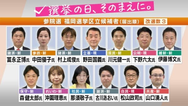 | 【さあ、開票だ。】参政・新人の中田優子さん「新たなスタートが待っています」激戦の福岡で当選確実 参院選2025 …参議院選挙は20日午後8時に投票が締め切られました。 福岡選挙区では参政党の新人、中田優子さん(35)が当選を確実にしました。 開票はまだ続いていま… (出典:FBS福岡放送) |