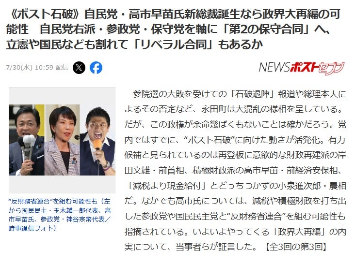 @puoifo《ポスト石破》自民党・高市早苗氏新総裁誕生なら政界大再編の可能性 自民党右派・参政党・保守党を軸に「第2の保守合同」へ、立憲や国民なども割れて「リベラル合同」もあるか(NEWSポストセブン) news.yahoo.co.jp/articles/a5db6…