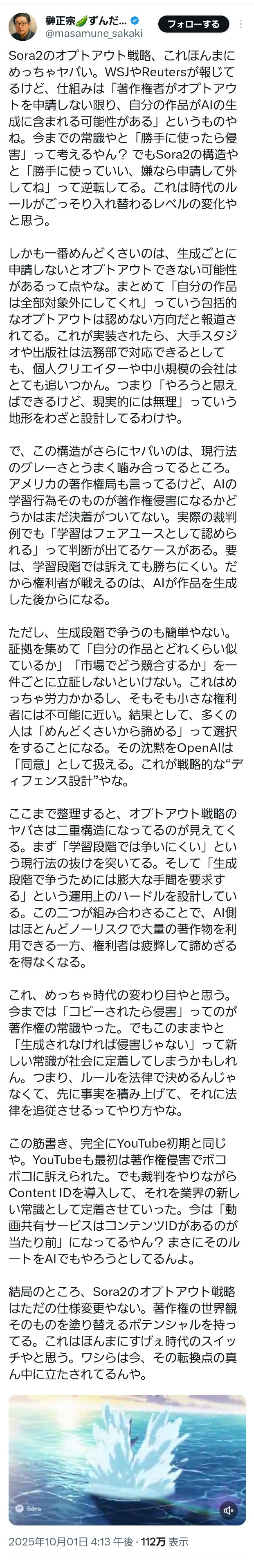 ”OpenAIは一部のスタジオやタレント事務所に対し、Sora 2の公開前にオプトアウト手続きの通知を送ったという。”