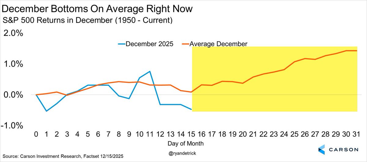 @heihachiro888米国株🇺🇸はサンタ🎅ラリーの始まりか? いわゆる「サンタクロース・ラリー」は、年末最後の5営業日+年始最初の2営業日に起きる上昇局面。 今年は12月24日寄り付きから2026年1月5日まで。1950年以降、この間のS&P500の平均上昇率は+1.3%。 pic.x.com/FKzf9fgNch