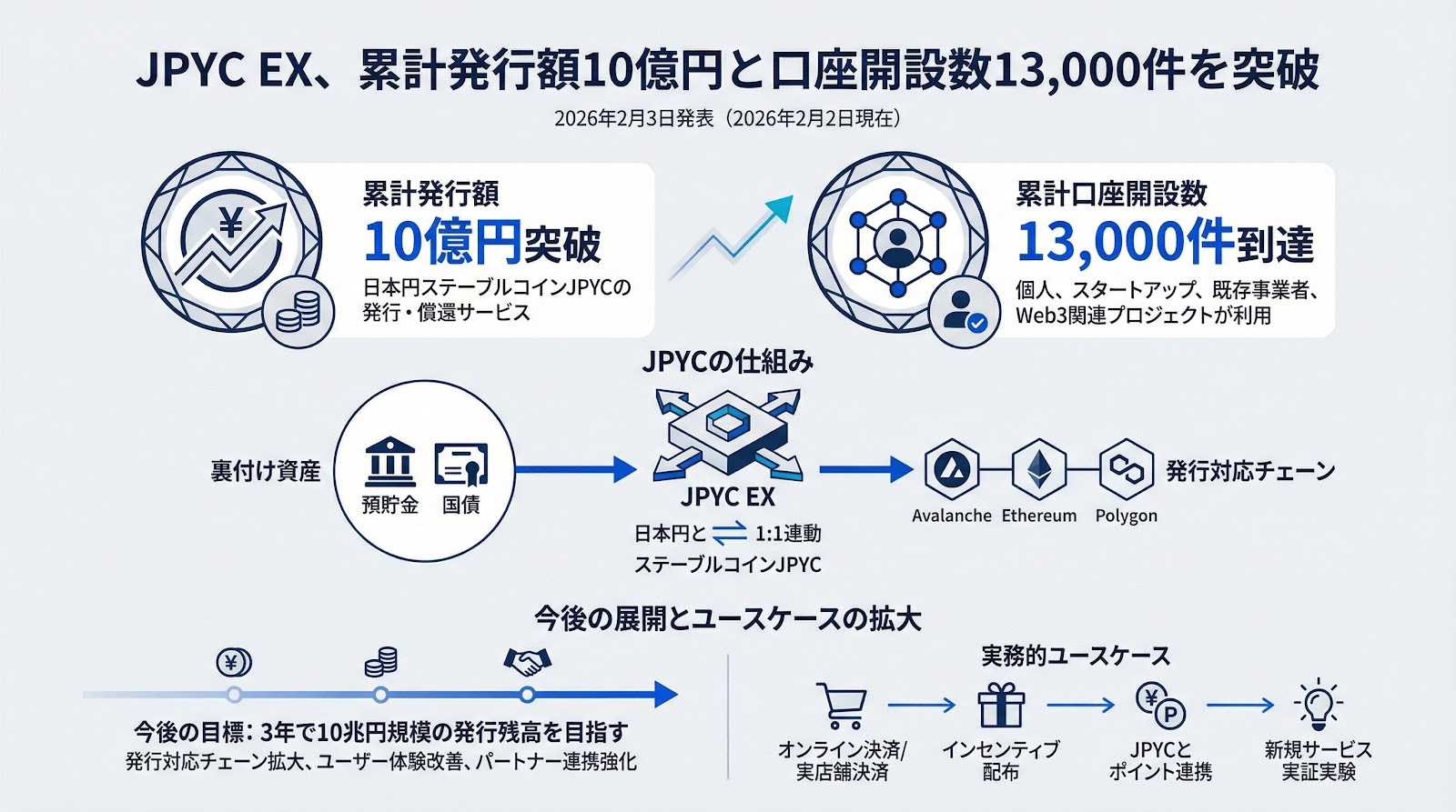 @jpyc_official日本円ステーブルコイン「JPYC」の発行・償還サービスJPYC EX にて、 ✅ 累計口座開設数 13,000件 ✅ 累計発行額 10億円 を突破しました! 今後も安心して使える社会インフラの実現に取り組んでまいります。 引き続き、JPYC / JPYC EXをどうぞよろしくお願いいたします。 prtimes.jp/main/html/rd/p…
