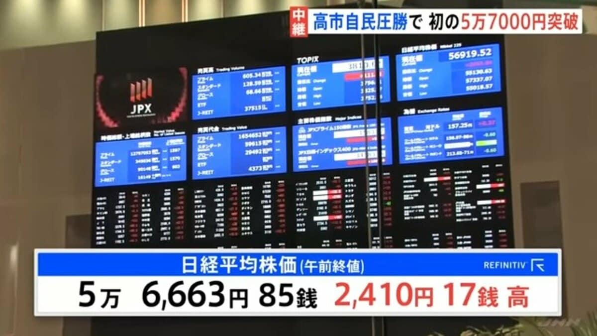 | 自民圧勝受け 日経平均一時5万7000円台「日本買い」で史上最高値に …衆議院選挙での自民党の圧勝を受けて、日経平均株価は大きく値を上げ、史上最高値を更新しました。 東京株式市場では取引開始直後から全面高となり、日経平均… (出典:日テレNEWS NNN) |