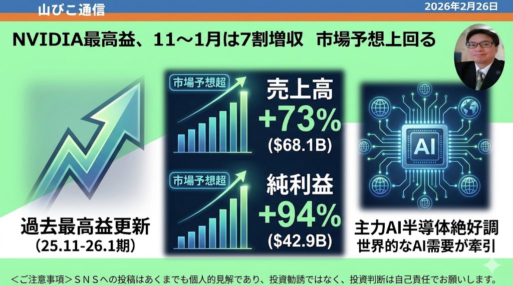 @rYubudNAc432094NVIDIAの決算でましたね。恐ろしい業績(売上高+73%、純利益+94%)。うちの会社も見習ってほしい😅