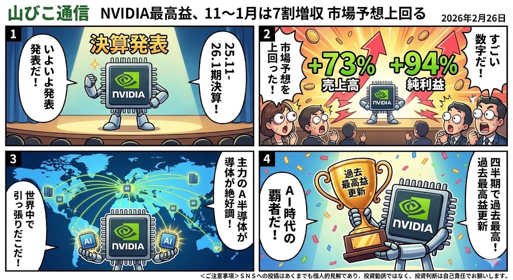 @livedoornews【発表】米エヌビディア、四半期純利益6兆7千億円 news.livedoor.com/article/detail… 米半導体大手エヌビディアが25日に発表した2025年11月~26年1月期決算は、純利益が前年同期比94%増の429億6千万ドル(約6兆7千億円)だった。売上高も73%増で、いずれも四半期として過去最高を更新した。