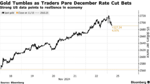 @miyakoaoiumi11月25日 14:48のブルームバーグ。「金価格下落、2700ドル割れ-米企業活動拡大加速で金融政策注視」とのタイトル。 「22日に発表された11月のS&Pグローバル購買担当者指数(PMI)速報値で、2022年4月以来の米企業活動拡大ペースが示され」 bloomberg.co.jp/news/articles/… @businessより