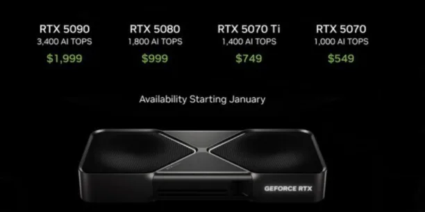 | NVIDIAの新世代GPU「GeForce RTX 50」シリーズ正式発表! 「RTX 5090」は1,999ドル~ NVIDIAは1月7日、新型コンシューマー向けGPU「GeForce RTX 50」シリーズを発表した。1月中に発売予定で、価格は549ドルより。 (出典:) |