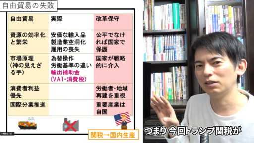 また、動画では、政策の背後にある経済学者オレン・キャス氏を中心とした改革保守派の思想についても解説。この思想は自由貿易がもたらしたアメリカの製造業の空洞化や中流層の経済的困窮に対する反省から生まれたものです。また、アメリカは市場原理の下、消費者の利益を優先してきましたが、改革保守派はそれが間違いであったと指摘し、自国の労働者と地域の再生を重視する新しい経済モデルを提案しています。