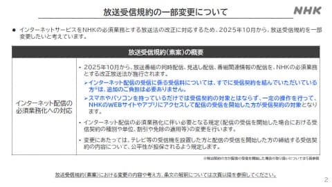 NHKは、今年10月からの「インターネットサービスの必須業務化」に対応するための受信規約、および受信料免除基準の変更素案を公表した。