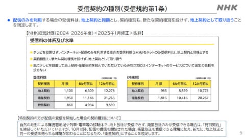 ただし、難視聴地域や電車等の移動体の関係で地上放送が受信できず衛星契約のみ受信している「特別契約」の利用者が、10月以降に配信の受信も開始した場合は、「衛星契約」扱いとなる。