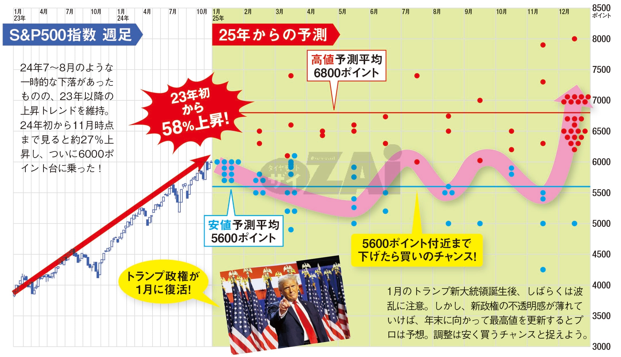 ![]() | 【米国株】2025年12月までの「S&P500指数」の値動きを予測! 7~9月頃までは株価調整も、秋口からは上昇に転じ、年末に高値を更新するのがメインシナリオ 【米国株】2025年12月までの「S&P500指数」の値動きをアナリストなどのプロ36人が予測! ●関税だけでなく業績低迷、債券リスクなど問題は… (出典:ダイヤモンド・ザイ) |